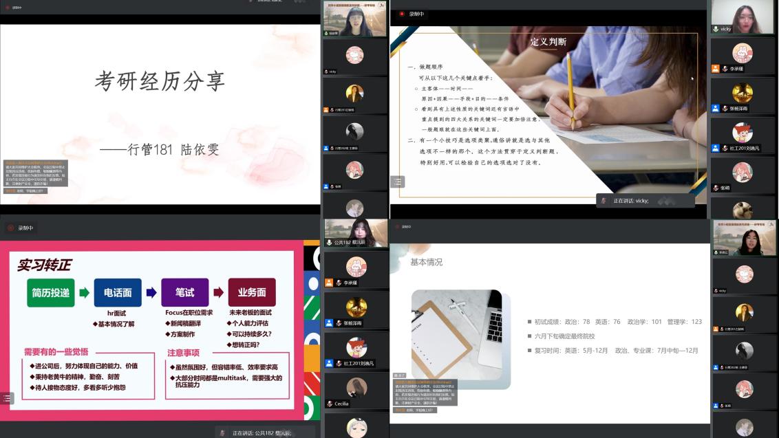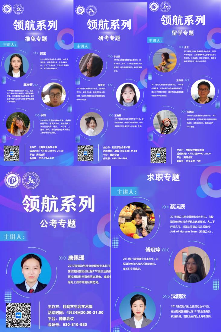 为了帮助本科生清晰自我定位,合理规划未来发展路径,了解升学、就业的相关知识,拓宽相关信息来源的渠道,为同学们进行答疑解惑,助力成才发展,社会与3003新葡的京集团网址于4月21日至4月25日连续举办五场发展领航系列经验交流分享会,分为研究生推免、考研、留学、求职及公务员考试五个分会场,五场在线参与人次累计超过2000人次,聆听朋辈经验,助力梦想启航。