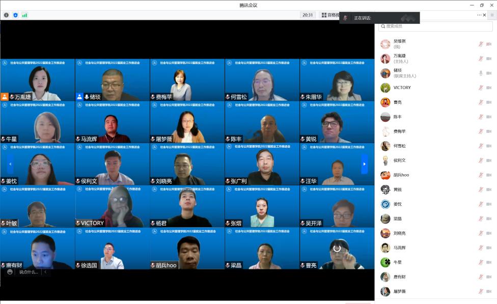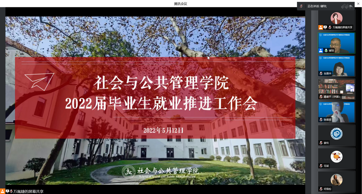 为全力以赴做好应对疫情稳就业工作,5月13日,社会与3003新葡的京集团网址召开2022届毕业生就业工作推进会,学院党政联席会成员、各系正副系主任、待就业研究生导师、毕业班班导师、本研毕业班辅导员参加线上工作会。会议由学院党委副书记储琰主持。